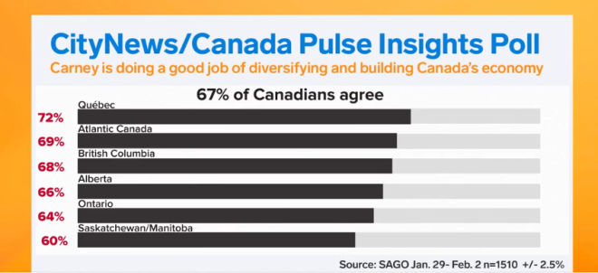 CityNews/Canada Pulse Insights民调显示,67%的受访者认为总理在推动加拿大经济多元化和建设方面做得很好。其中支持率最高的是魁北克(72%),其次是大西洋省份(69%)和卑诗省(68%)。