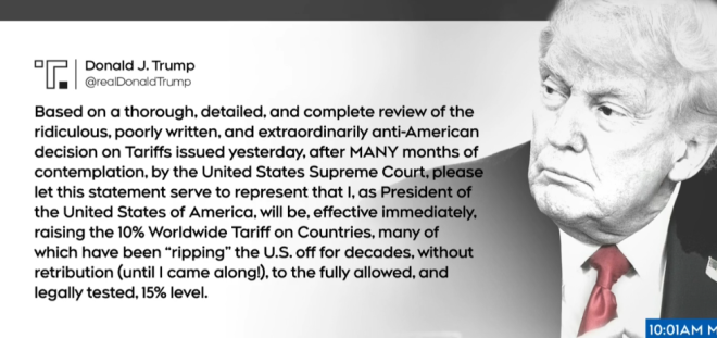 总统反复无常的关税威胁于周六继续,他承诺将把新的全球关税提高至15%,就在最高法院否决美国总统偏好的关税工具一天之后。
