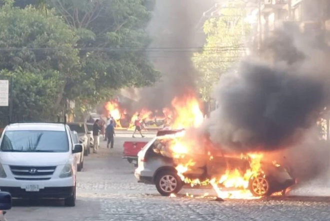在Puerto Vallarta,城市上空升起浓浓黑烟。据报道,该地区已有超过10辆车辆在不同地点被纵火焚烧。