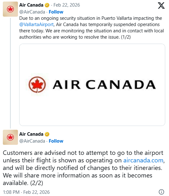 加拿大航空公司取消航班周日下午,加拿大航空在X平台发文称:“由于Puerto Vallarta持续的安全问题,影响了机场运营,我们今天暂时中止了该地航班。我们正密切关注局势,并与当地政府保持联系,以解决问题。”
