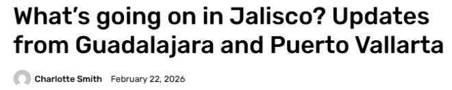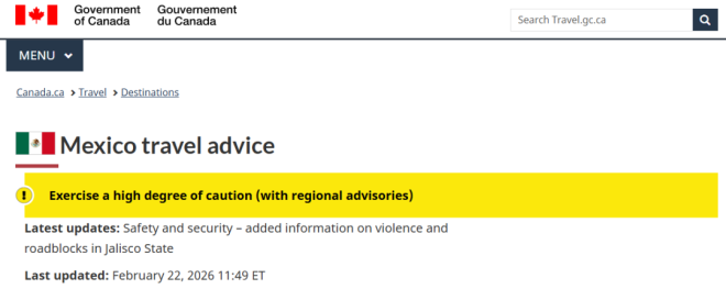 2月22日中午,加拿大外交部(Global Affairs Canada)更新了对沿海城市Puerto Vallarta及Jalisco其他地区的旅行警告。原因是当地近期暴力事件突然升级,出现车辆被纵火堵路、联邦当局与武装团体冲突等情况。