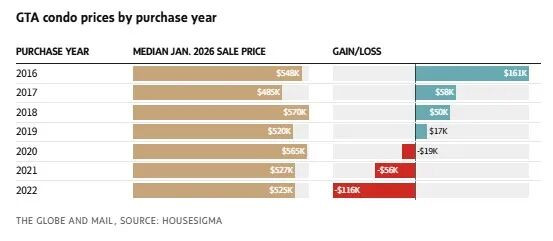 根据房地产数据平台HouseSigma今年1月的数据,大多伦多地区2020年购入并于上月出售公寓的业主,中位数亏损1.87万加元;2021年购入者亏损5.6万加元;2022年购入者更是亏损高达11.6万加元,约19%。