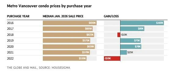 在大温地区,若业主在2022年初之后购入公寓并于上月出售,中位数亏损已超过7%。