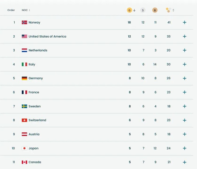 加拿大在此次冬奥会上共获得21枚奖牌:5枚金牌、7枚银牌和9枚铜牌,排在奖牌榜第 11 位。