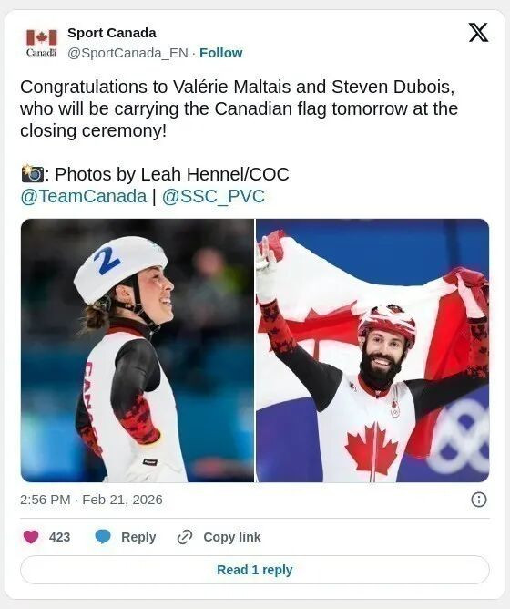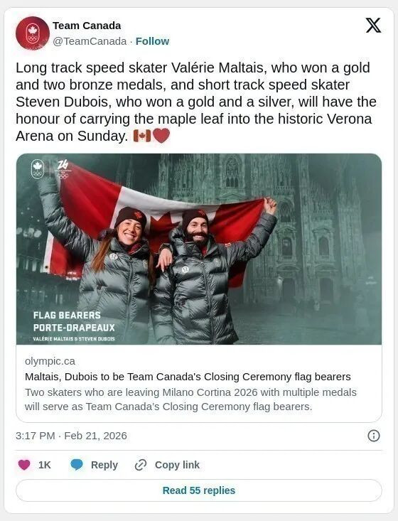 今日举行的2026年奥运会闭幕式上,速滑运动员瓦莱丽·马尔泰斯(Valérie Maltais)和短道速滑运动员史蒂文·杜波依斯(Steven Dubois),在奥运会闭幕式上担任加拿大代表团旗手。