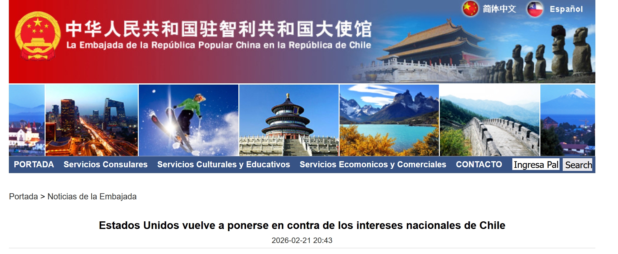 中国驻智利大使馆21日发表西班牙语声明,指责美国对“智利的主权、尊严和国家利益表现出明显蔑视”。