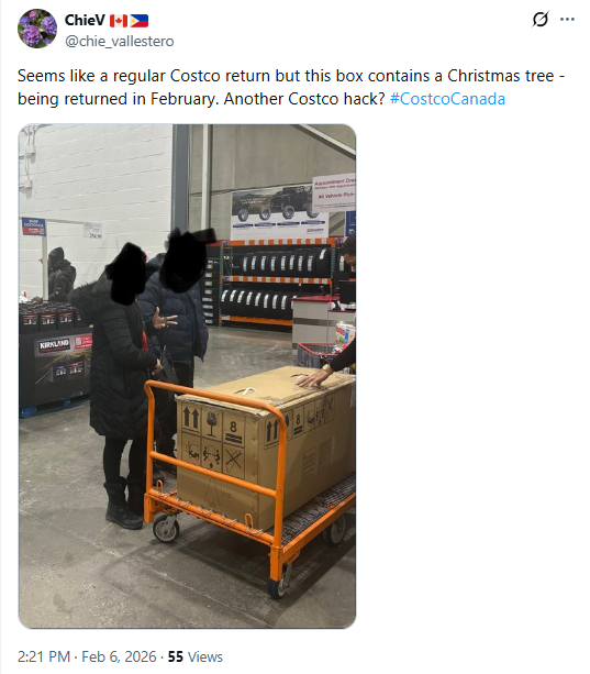 近年社交媒体上,各种Costco“奇葩退货”案例不断刷屏。例如,最近有加拿大网友拍到,有人在圣诞节过后很久退回圣诞树,还有人利用90天退货政策恶意“白嫖”。此前,曾有消费者因向Costco退回枯死的植物、吃了一半的饭菜、甚至用了15年的沙发而在网络上走红。