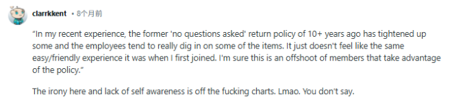 一位会员写道:“根据我最近的经历,10多年前那种‘不问理由’的退货政策确实收紧了,员工现在对某些商品会查得很细。这已经不像我刚入会时那样轻松友好了。”