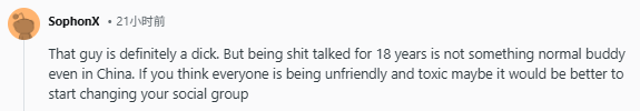 “那些人根本不是真正的朋友,他们的行为说白了就是在霸凌。正如你所说,你在这片土地上是自由的,你随时可以选择离开。希望你下次有勇气说‘不’。不过,需要强调的是——有毒的是那些人,而不是所有中国留学生。请不要把个人生活中的不愉快上升到族裔层面……我们之所以更容易注意到那些有毒的人,正是因为他们的行为太有毒、太显眼了。任何国家都会有不好的人。我在中国和这里都结交了很好的中国朋友。”