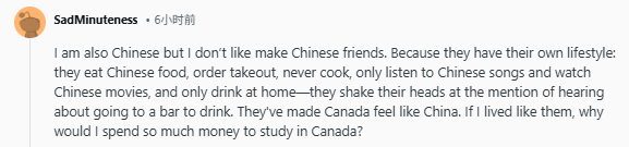 “我也是中国人,但不太喜欢只混华人圈。因为他们有自己的一套生活方式:吃中餐、点外卖、从不做饭,只听中文歌、只看中文电影,而且只在家里喝酒——一提到去酒吧,他们就直摇头……如果生活方式完全没变化,那为什么还要花那么多钱来加拿大读书?”