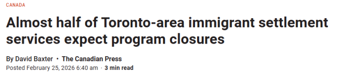 由于联邦政府自2024年开始削减拨款,大多伦多地区(GTA)近一半的移民安顿服务机构预计,未来不久将不得不关闭部分项目。
