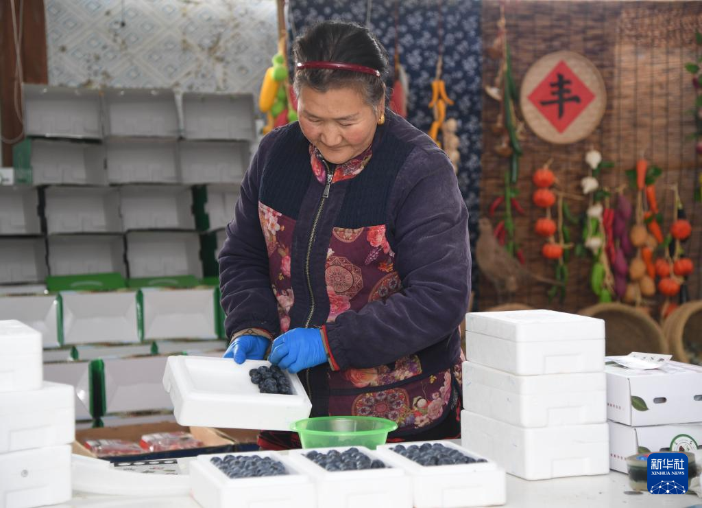2月26日,在北京市平谷区山东庄镇鱼子山村一处设施农业基地,工作人员将采摘好的蓝莓装箱。