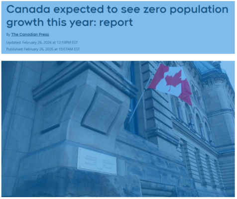 Statistics Canada數據顯示,2025年人口基本持平。PBO報告指出,雖然仍有部分人口增加,但被38.2萬名非永久居民減少所抵消。