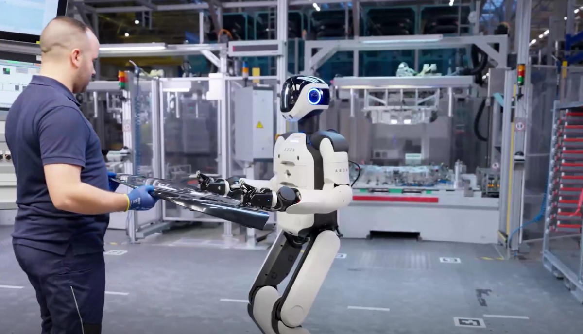 资料显示,AEON机器人身高1.65m,配备22个传感器与多类摄像头,可自主更换夹持工具,以毫米级精度完成钣金件定位、电池模组安装等复杂操作。其轮式移动底盘支持动态避障,在-20℃至50℃环境中稳定运行。