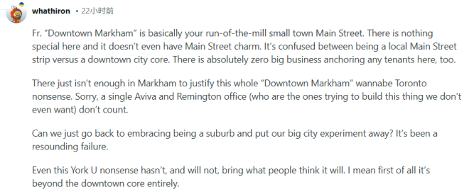 “说实话,‘万锦市中心’本质上不过就是一条普通的小镇商业街,没有什么特别之处,甚至连传统街区该有的吸引力都没有……而且,这里完全没有任何大企业作为‘核心引流’支撑商户。说白了,万锦根本没有足够多的东西来支撑这个所谓的‘万锦市中心’,我们能不能就坦然接受这里是个郊区?为什么非得硬凹‘市中心’人设?这场尝试可以说是彻底失败。就连约克大学那个项目,也没能、也不可能带来大家期待的效果。”