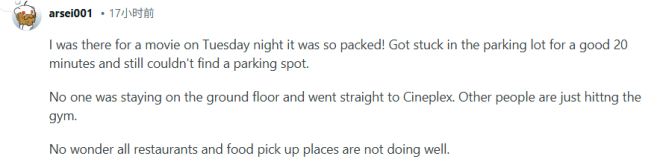 “周二晚上我去那里看电影,人太多了!我在停车场绕了20分钟都找不到车位。大家都是直奔二楼的电影院或者健身房,根本没人在一楼消费,难怪所有餐厅和外卖店的生意都不好。”