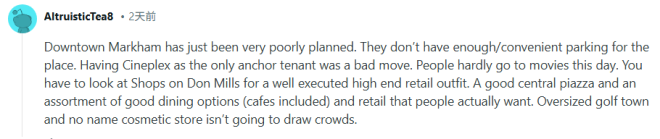 “万锦市中心的整体规划真的很糟糕,停车位不足且不方便。把Cineplex作为唯一的核心引流商户,本身就是一个错误的决定。现在这个时代,去电影院的人本来就越来越少。”