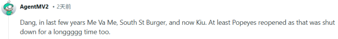 有网友盘点时无奈地说:“唉,这里过去几年关了多少家店了?Me Va Me、South St. Burger,现在连Kiu也没了。至少Popeyes终于重新开业了——那家之前也关了好久好久。”
