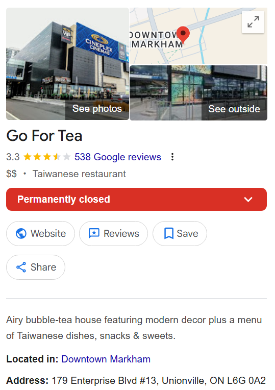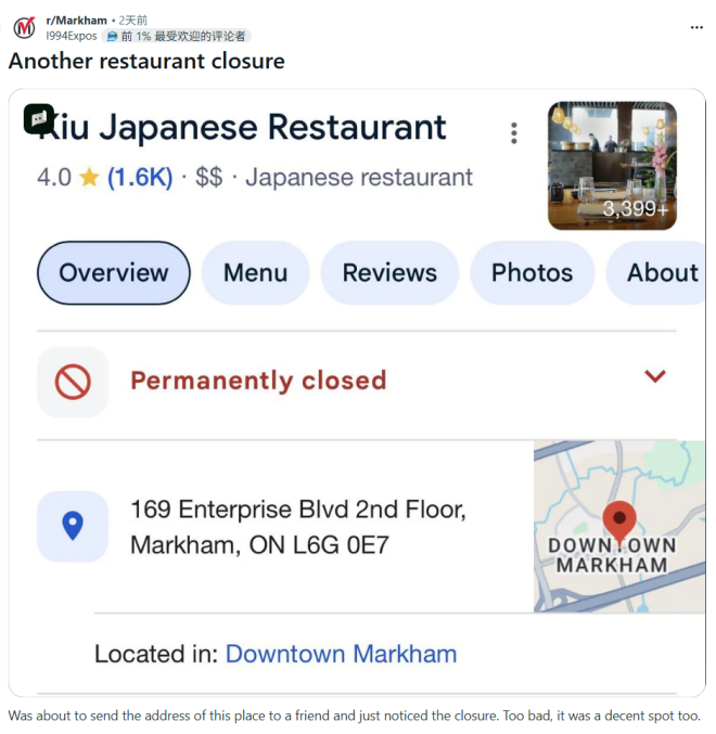 该网友表示,自己原本准备把餐厅地址发给朋友,结果一搜Google,页面上赫然写着永久关闭(Permanently closed)。