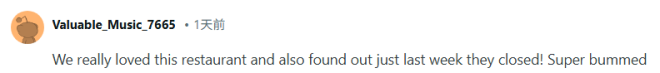 “我们真的很喜欢这家餐厅,上周发现他们关门了!真的太失落了。”