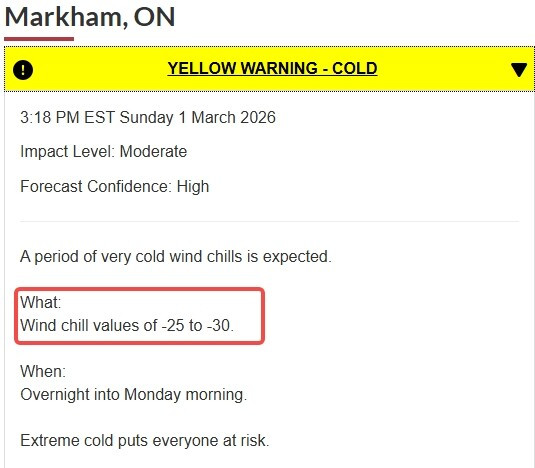 环境部表示,周日夜间至周一早晨,密西沙加、宾顿、旺市、列治文山、万锦、约克区北部以及汉密尔顿等地区,体感温度预计将降至零下25至零下30度之间。
