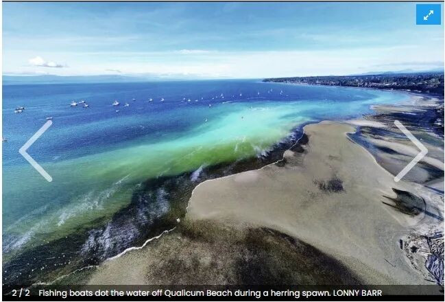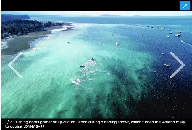 每年春季,加拿大BC省海岸都会上演一场规模惊人的奇观——鲱鱼(herring)大规模产卵。数以十亿计的鱼卵、数以百万计的鱼群,将原本深蓝色的海水染成乳白色或碧绿色,海水呈现出热带般的色彩,场面之壮观甚至可在太空中观测到。