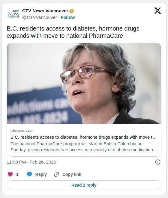B.C.卫生厅长奥祖宜(Josie Osborne)表示,此次变革将惠及超过50万糖尿病患者以及约16万更年期症状患者。