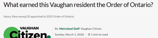 旺市社区领袖萧美珍(Nancy Siew)近日被授予勋章(Order of Ontario),这是安省最高级别的平民荣誉。