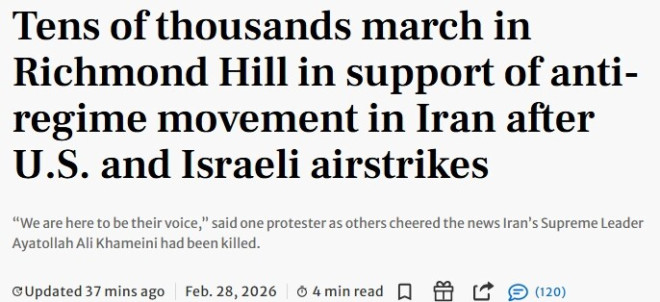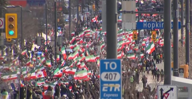 组织游行的多伦多组织“居鲁士大帝”(Cyrus the Great)代表Alan Bostakian表示,他周六凌晨3点接到朋友电话得知空袭消息。他说:“这是伊朗人民的国家利益第一次与西方,包括美国和以色列的利益一致。我们有共同目标和共同敌人。”