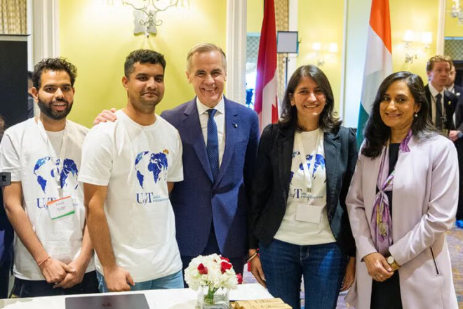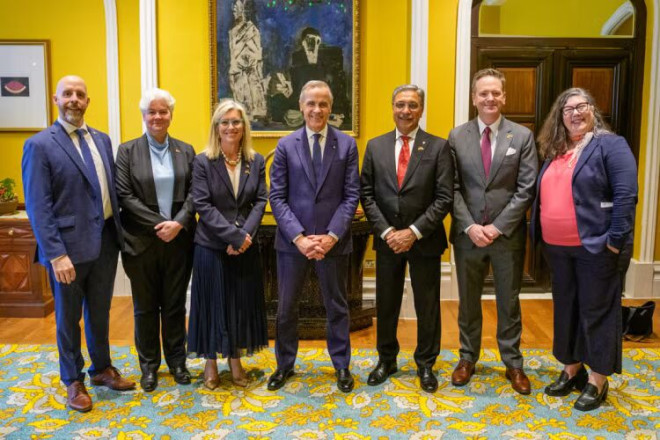 加拿大总理卡尼(中)与外交部长 Anita Anand(右)会见由多伦多大学印度基金会支持、并由罗特曼管理学院助理教授 Anjana Dattani(右二)指导的初创企业创始人。(照片由总理办公室摄影师 Lars Hagberg 拍摄)