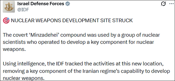 以色列国防军在社交平台发布声明称,名为“Minzadehei”秘密场所被一个研发核武器关键部件的核科学家小组使用。“以色列国防军利用情报,追踪到在该新地点的活动,清除了伊朗发展核武器能力的关键一环。”