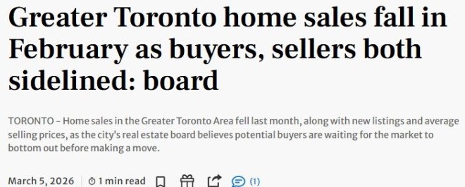 都在等触底!大多伦多房市销量、挂牌和房价2月全线下滑