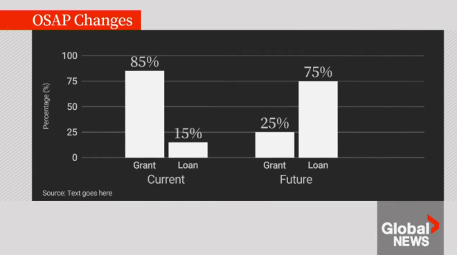政府表示,目前OSAP的资金比例大约是85%为补助金、15%为贷款。但从今年秋季开始,学生最多只能有25%的OSAP资助以补助金形式发放,其余都将以贷款形式提供。