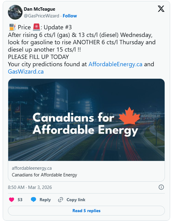 据本地英文媒体CP24报道:“加拿大可负担能源协会”(Canadians for Affordable Energy)主席麦克蒂格(Dan McTeague)表示,他本周早些时候已预测到这一轮涨价,并称周四油价可能还会再涨6分。