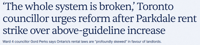 代表该区域的4区(Parkdale-High Park)议员Gord Perks表示,虽然房东和租客都没有联系过他,但他对租客的抱怨表示支持。他补充说,AGI只是《租赁法》中众多无法保护租客的漏洞之一。
