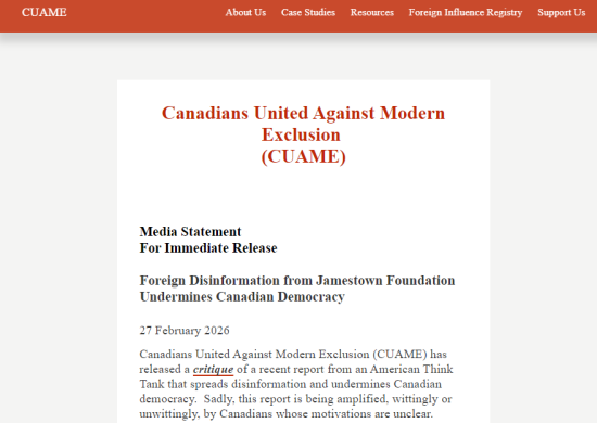 【時報訊】加拿大反對現代排斥聯盟 (CUAME) 2月27日發布了一份評論,批評美國智庫近期發布的報告。該報告散佈虛假訊息,損害加拿大民主。令人遺憾的是,一些動機不明的加拿大人,無論有意或無意,都在傳播這份報告。
