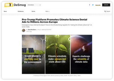 ▲國際環保組織“消除霧霾”調查報告截圖。圖中是《大紀元時報》在元宇宙平台賬號上發布的三個否認氣候變化視頻