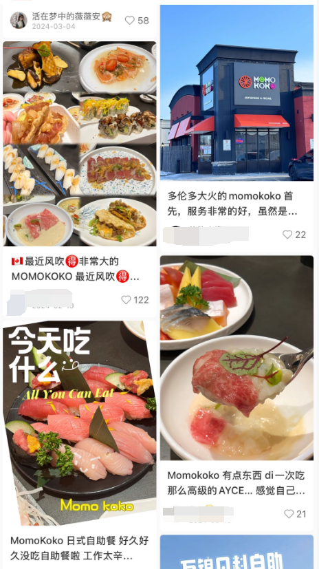 Momokoko开业后,很快就在华人社交媒体和美食群里走红。该餐厅主打All-You-Can-Eat任食日料,人均价格大约50–60加元。在任食日料中,这个价位虽然不算便宜,但不少食客认为品质对得起价格。