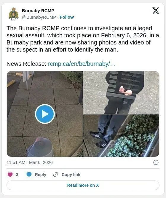 警方公布了监控录像和照片,以期确认上个月在BC省本拿比市一个公园发生的性侵案的嫌疑人身份。