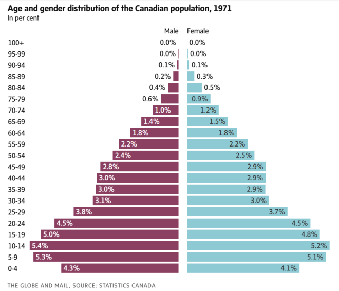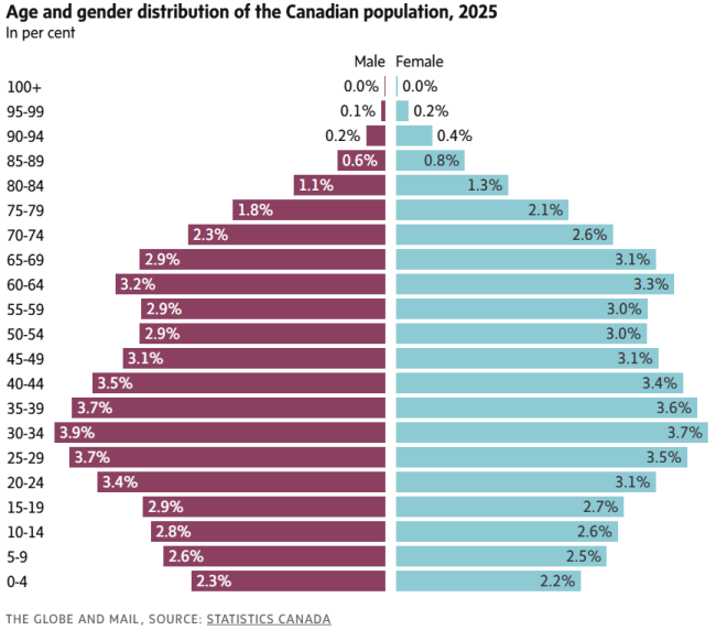 数据显示,加拿大城市的人口结构正在发生变化——平均年龄不断上升,年轻人口比例明显减少。许多城市呈现出类似“蘑菇形”的人口结构:老年人口越来越多,而年轻人越来越少。