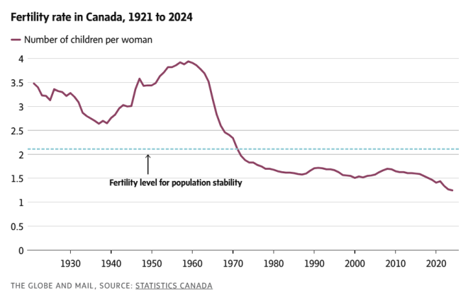 人口学家指出,要维持人口稳定,加拿大的生育率需要达到2.1。这一指标指的是一名女性一生平均生育的子女数量。