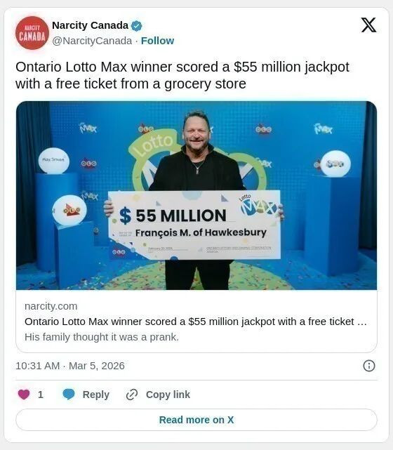 安省最新一位乐透大奖( Lotto Max) 赢家用一张免费的乐透票赢得了 5500万加元大奖,令人难以置信。