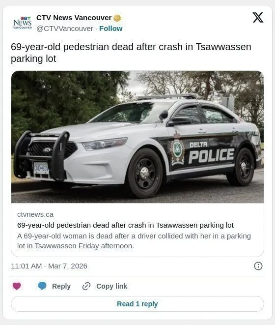 周五下午,一名69岁女子在大温Tsawwassen一处停车场内被车辆撞击后不幸身亡。