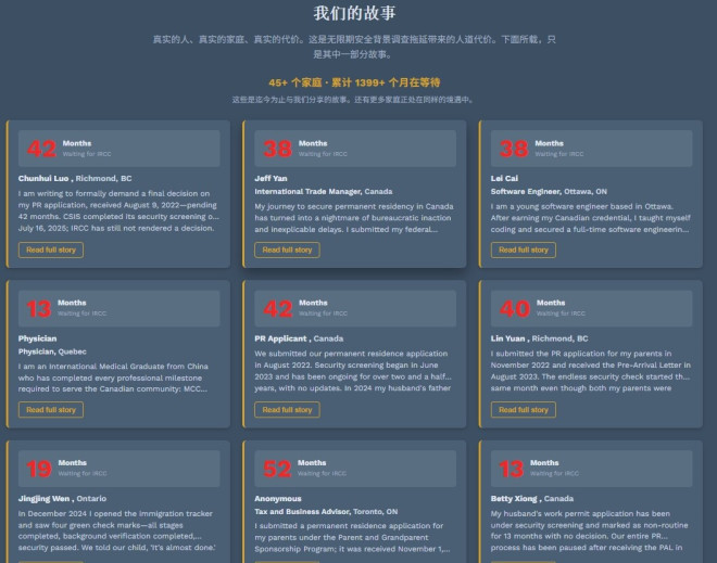 在集会召集网页上,有45位申请人分享了自己在漫长等待中的个人经历。对许多人来说,移民审批延迟深刻地影响了家庭、职业和生活规划。
