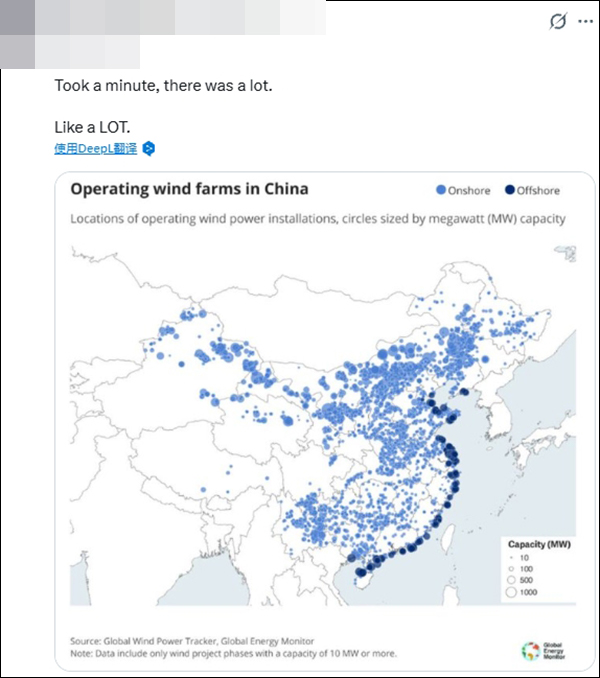 一名行动力强的网友直接在谷歌地图上随意点了中国中部某个地方,就发现了一座风电场,“花了大约6秒钟”。好几位网友则直接贴上了中国风电场的分布图。