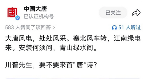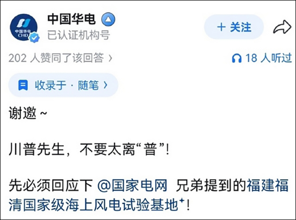 1月底,多家中国企业纷纷上线晒出自家业务,接住特朗普泼来的“流量”。中国华电集团有限公司对特朗普喊话说“川普先生,不要太离‘普’!”,随后分东西南北四个方位,介绍了公司在福建、广东、山东、宁夏、西藏等地的风电场。