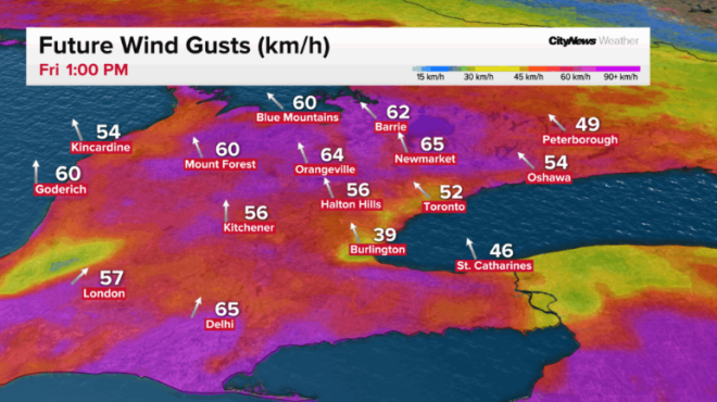 随着这次天气系统的到来,周五白天风力也将逐渐增强,多伦多市内的阵风可能达到每小时50至60公里。
