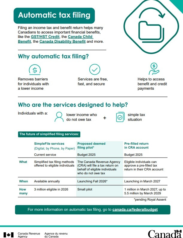 如果相关法案获得御准(Royal Assent),政府计划在今年秋天推出一个试点项目,目前被称为 “自动报税试点”(proposed deemed filing pilot)。在该计划下,对于符合条件且不欠税的人,CRA可以直接代为完成报税,除非当事人选择退出。