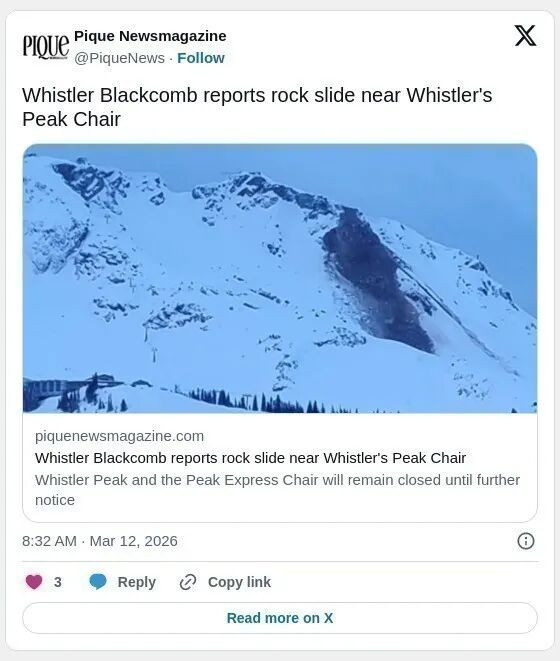 目前细节尚不清楚,但惠斯勒黑梳山度假村于3月12日上午发布声明证实了此事。