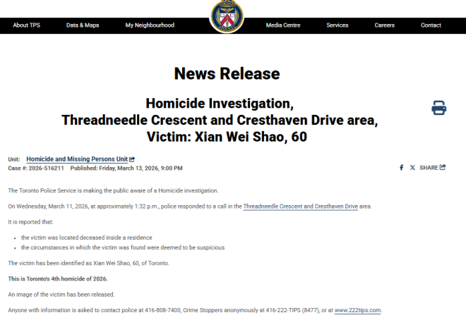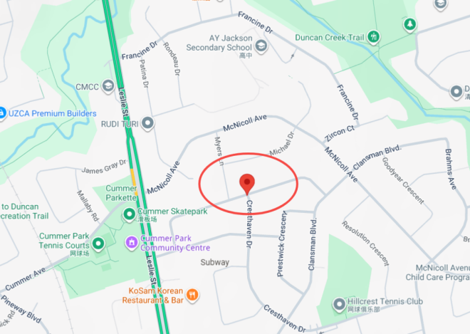 警方表示,本周三(3月11日)下午约1点32分,警员接报赶到位于北约克ThreadneedleCrescent与CresthavenDrive(靠近Leslie St.与McNicoll Ave.)附近一处住宅,在屋内发现一名女子已经死亡。
